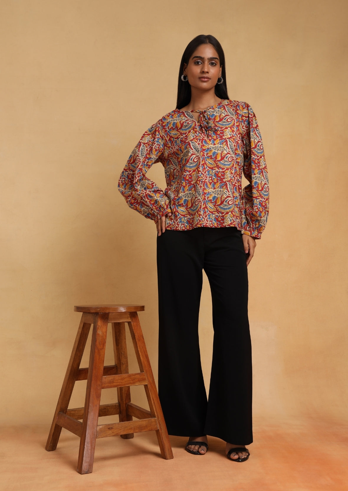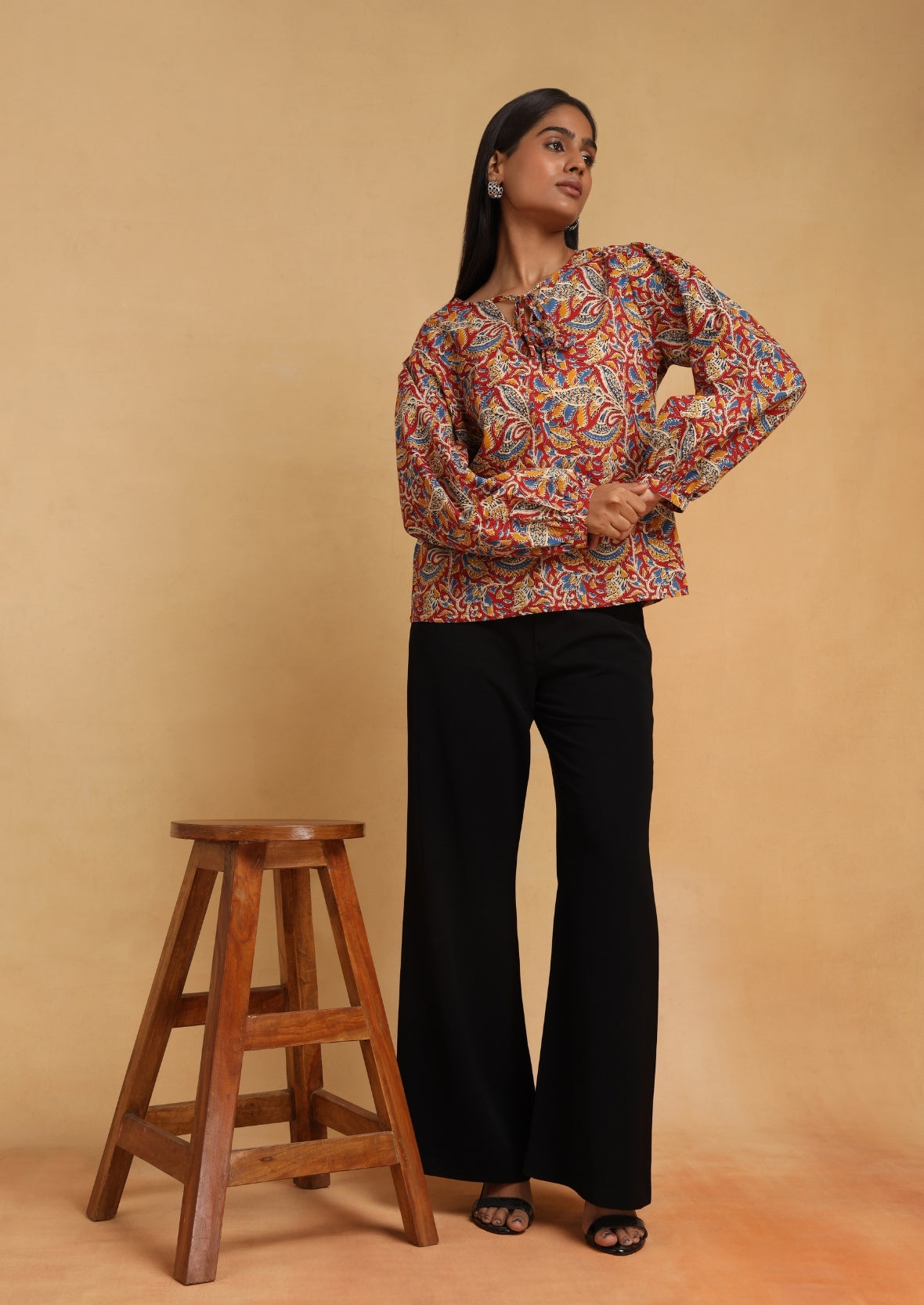 Traditional Kalamkari Print: Features intricate Kalamkari motifs in vibrant reds, blues, and yellows, adding a touch of heritage to your wardrobe.